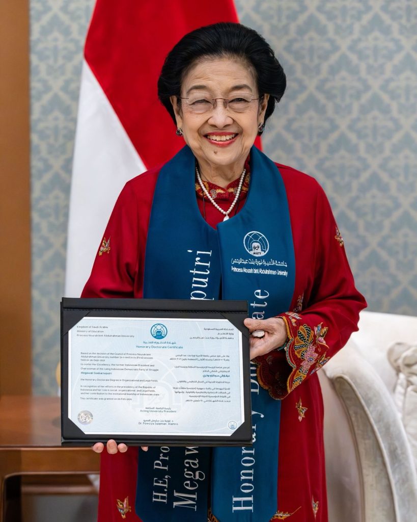 Presiden Kelima Republik Indonesia, Megawati Soekarnoputri, menerima gelar Doktor Kehormatan (Honoris Causa) dari Princess Nourah bint Abdulrahman University (PNU), Riyadh, Arab Saudi, pada Senin (9/2). Gelar kehormatan tersebut dianugerahkan oleh Fakultas Hukum PNU sebagai bentuk pengakuan atas dedikasi dan kontribusi Megawati dalam memperjuangkan demokrasi, nilai-nilai kemanusiaan, serta pemberdayaan perempuan di tingkat global.